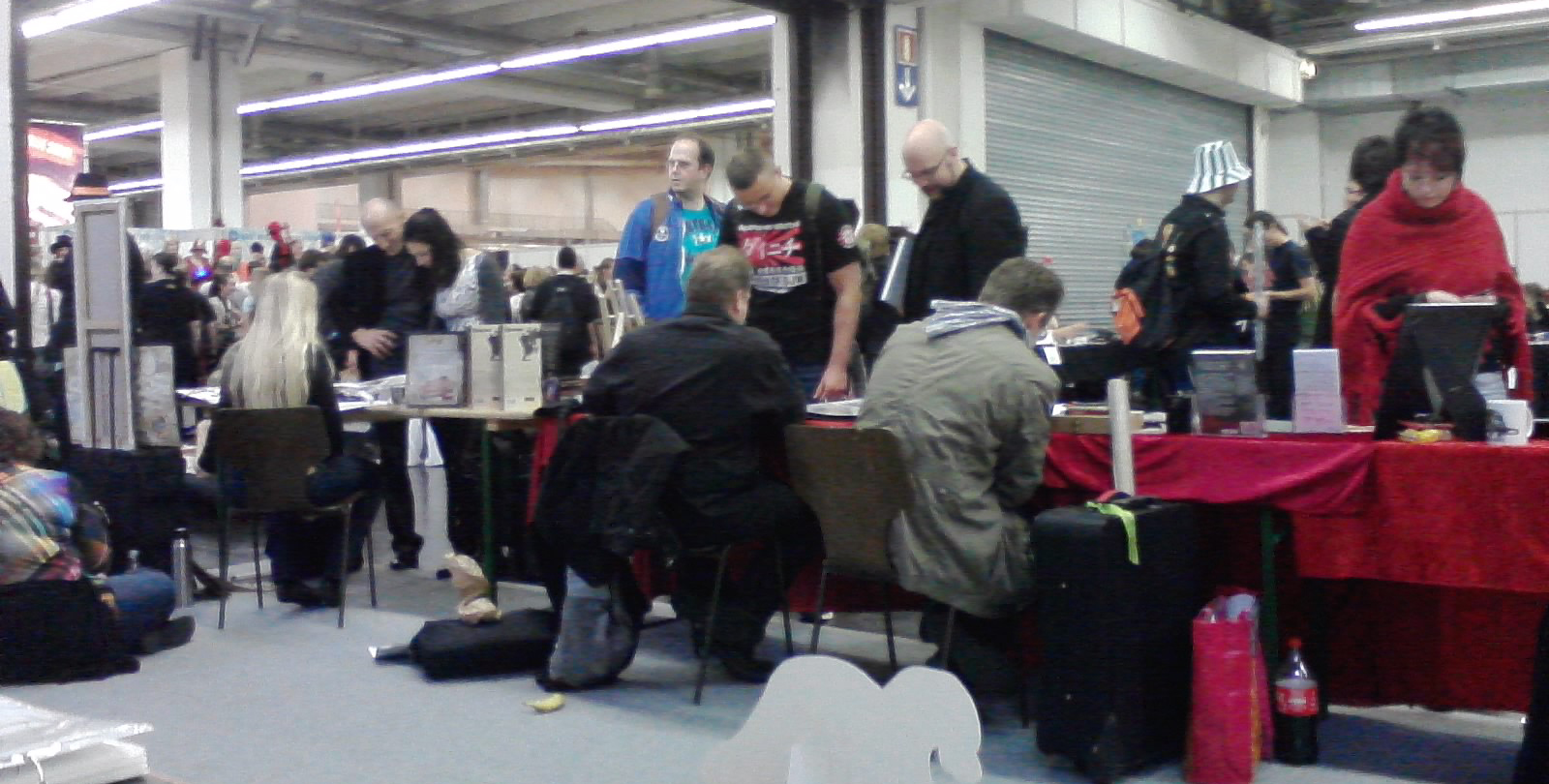 Ganz besondere Mühe gegeben haben sich Michael Roos (Impression #01) und David Michael Malambré. Bei ersterem gab es ernsthafte Abendmahlartige Zeichenanfälle (Impression #02), während letzterer einen knallharten unzensierten Blick auf die Verhältnisse am Stand von Kwimbi geworfen hat. Generell war der große Stand von Kwimbi und dem Schwarzen Turm ein Fokuspunkt der ComicAction, wenn man sich für die großen Verlage wie Panini und Co. nicht so sehr interessierte, oder von den ganz großen der Zunft schon seine Comissions eingesammelt hatte.