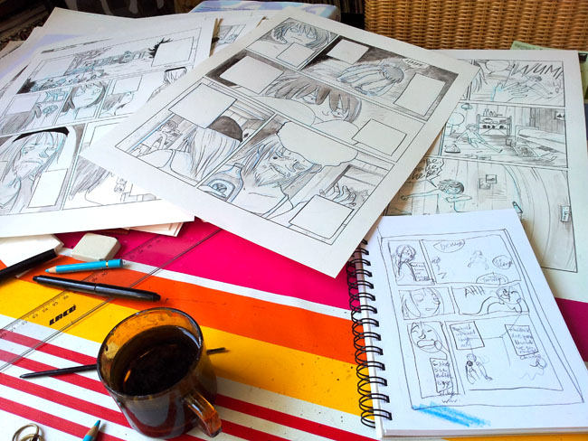 Nebenbei mache ich noch Kinderbuchillustrationen, das ist nicht ganz so zeitaufwendig. Und da mach ich Projekte, von denen man in der Comicszene nicht direkt etwas mitkriegt. Das mache ich praktisch zum Geldverdienen, denn mit Comiczeichnen allein ist es nicht ganz so fett.