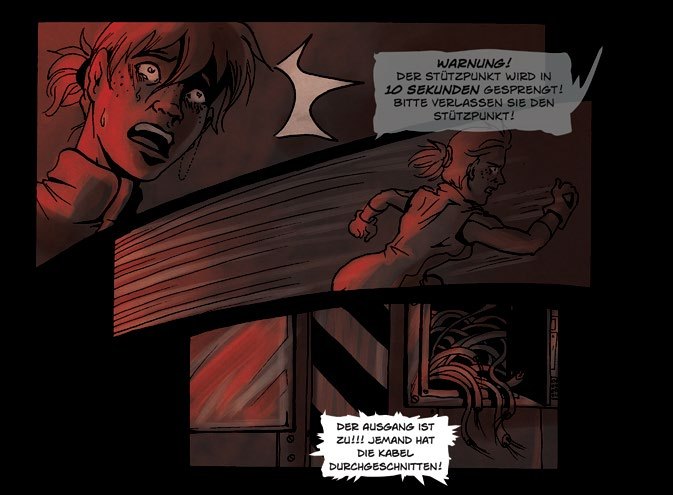 TeMeL hat sich für ihre Rätselhafte Explosion in der Kalahariwüste den eigenen Wunsch erfüllt mal etwas mehr Richtung Sci-Fi zu gehen und hetzt ihre Figur durch ein klaustrophobisches Fluchtszenario, das an die guten Sci-Fi-Horrorklassiker erinnert. Wie schon bei Michael merkt man auch hier den ganz anderen Stil, den sie nutzt. Anders als in ihrem Webcomic oder ihrem Erstling Wohlstand gibt es hier eine ganz andere Figurenzeichnung und Dynamik. Das Tempo und die Panik sind spürbar und hetzen auch den Leser, während Wohlstand eher eine beklemmende und weniger treibende Panik beim Leser auslöste.
