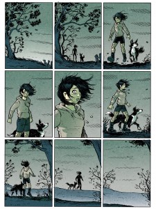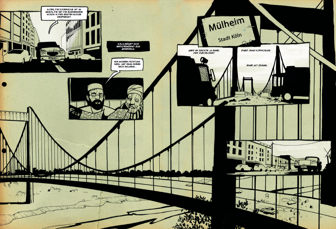Wendet man sich der letzten Geschichte zu, wird man schnell irritiert sein. Weder der Zeichenstil noch der Inhalt scheinen zu den ersten beiden Geschichten auch nur annähernd zu passen. Als wäre dies nicht genug, wagt sich die Geschichte auch noch an das brisante Thema Islam und Fanatismus. Wieder einmal dürfen die Zombies als Metapher dafür herhalten, dass uns alle im Grunde doch ähnliche Ideale antreiben. Dass man dabei, aus welchem falschen Einfluss heraus auch immer, auch auf eine mehr als fragwürdige Bahn geraten kann, ist offensichtlich und die Geschichte würde ebenso mit christlichen Fanatisten oder überzeugten Homophoben funktionieren. Doch Matthias Dinter und Herr M wagen sich weiter vor und füllen den Road-Trip ihrer kleinen Dschihadisten-Gruppe mit einer Verbeugung vor der Religion an sich, die jede Skepsis verblassen lässt. So wie es eine Tatsache ist, dass der durchschnittliche Katholik seine Religion längst nicht so inbrünstig lebt wie der durchschnittliche Islamist, ist es genauso wahr, dass religiöse Spinner und Fanatiker immer und auf allen Seiten existieren, sodass das Problem nicht in der Religion, sondern in einigen Menschen liegt, aber auf keinen Fall bei den Zombies. Grafisch präsentiert Herr M eine kontrastreiche Welt vor warmen Hintergründen, die die Figuren oft alleine lässt vor einer Welt, die nicht mehr so ist wie sie es kennen und in der sie versuchen mit gewohnten Riten und Verhaltensmustern ihren Platz zu finden.