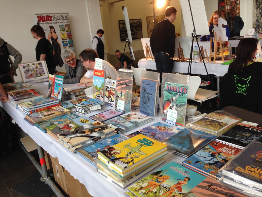 Unter den Ausstellern waren wieder viele junge und alte bekannte Gesichter vorhanden. Sowohl David Boller mit seinem inzwischen ziemlich umfangreichen Programm als auch Michael Holtschulte, die Kwimbi-Truppe (also Sarah Burrini, Marvin Clifford, Mario Bühling und dieses Mal auch Schlogger) und Dani Books waren vertreten. An letzterem Stand konnte man sowohl den Italiener Giovanni Rigano (Daffodil, Monster Allergy) und seine Landesgenossin Paolo Antista antreffen, deren fünfbändige Comicreihe Chats im Sommer bei Dani Books erscheint. Panini lockte unter anderem mit Signierstunden von Roger Langrigde (Muppets, Thor) und Sylvian Savoia (Marzi). Dazu kamen noch viele weitere Zeichner aller Stilarten, die für eine bunte Mischung sorgten, unter ihnen auch David Malambré, Stephan Scholz, Sascha Küpper, Pinkmützchen und Kamineo.