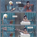 Das beste Händchen besitzt die Autorin aber zweifellos beim Slapstick und Timing, so dass es ihr möglich ist, selbst widersprüchliche Zutaten zusammenzuwerfen und daraus eine funktionierende Szene zu gestalten. Darin spürt man sehr viel Spontanität und Lust am Medium Webcomic. Wäre die Geschichte von vornherein auf eine Printveröffentlichung hin getrimmt worden, wäre sicher viel mehr Arbeit in die Planung und Kontinuität der Handlung geflossen. Statt dessen gleitet die Geschichte angenehm zwanglos von Szene zu Szene und nimmt sich einfach immer wieder die Zeit für einen weiteren Gag oder eine Randnotiz, die dem Hintergrund der Figuren etwas mehr Fleisch hinzufügt. Dies widerspricht zwar jedem Grundsatz für strukturiertes Erzählen, zeigt aber, wie behände Smith beim lockeren und improvisierten Erzählen ist.