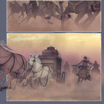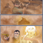 Plume hat ein Western-Setting… zum Teil. Genau betrachtet reduziert sich der Western auf einige vordergründige Details und den losen Rahmen, doch schon dieser ist mit zahllosen Flicken aus der Fantasy und dem Slapstick-, Romance- und Coming-Of-Age-Milieu gestopft. Was Puristen oft Hosenflattern verursacht, ist dabei das Beste, was dem Comic passieren kann.