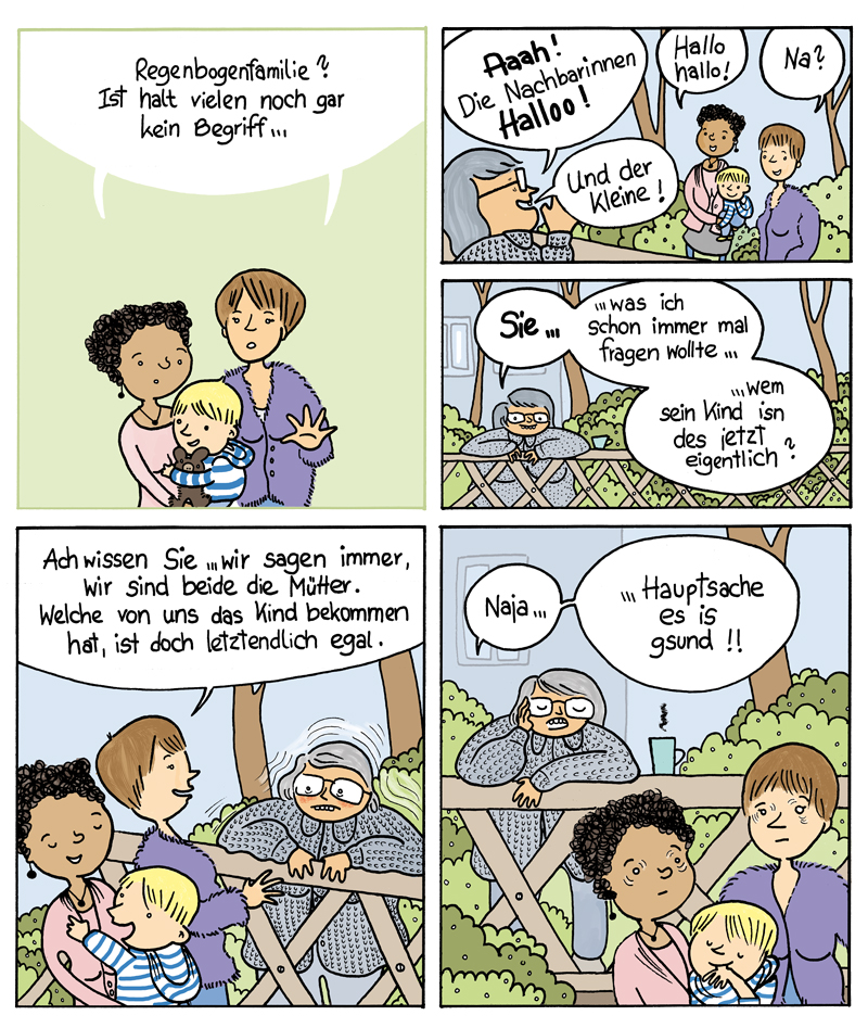 All das ist in farbenfrohen und unverkrampften Zeichnungen festgehalten. Meistens gelingt es diesen auch die Problematik, die oft nur schwer in Worte zu kleiden ist, statt dessen in überschaubaren und gut pointierten Bildern auszudrücken.