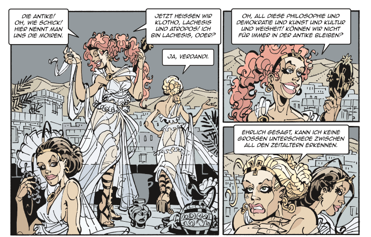 Für die die es noch nicht Wissen: Die Handlung dreht sich um einen Wissenschaftler der mithilfe dreier magischer Module eine Weltuntergangsmaschine bauen will. Die Nornen, Schicksalsgöttinnen des Gestern, heute und des kommenden dürfen nicht aktiv in die Welt eingreifen. Also requirieren sie einen sterblichen als ihren Handlanger. Damit sie diesen aber in ihrem Sinne steuern können, muss er zuerst sterben damit sein Geist die Brücke zwischen der Welt der Nornen und der sterblichen bildet. Während also im Jahr 1928 der Professor das Ende der Welt einläuten will, reisen die Nornen zusammen mit Chris quer durch die Zeitalter um eben dies zu verhindern. Klingt verwirrend, ist es auch zu Anfang, macht dennoch Spaß. Glaubt mir, oder lest meine Rezensionen zu Band 1 und Band 2.