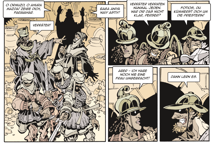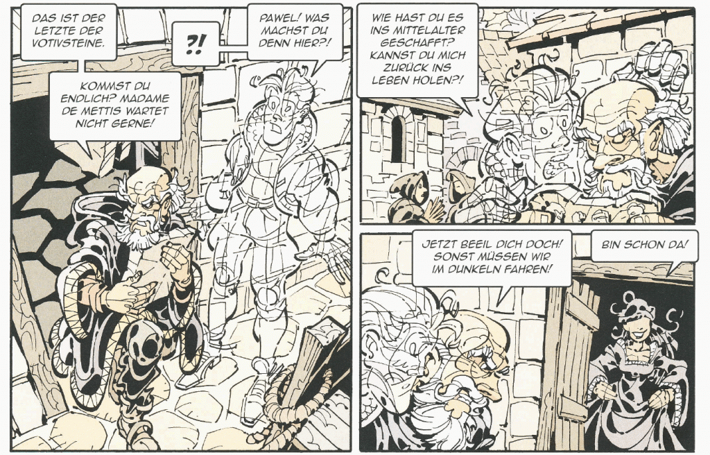 Bei einem Arbeitstier wie Erik kommt man bei regelmäßigen Kritiken irgendwann an den Punkt, wo es schwer fällt sich bei der zeichnerischen Bewertung nicht zu wiederholen. Wie gehabt arbeitet der Saarländer auf stetig hohem Niveau und fast alles was schon zu Band 2 gesagt wurde, behält auch bei Band 3 seine Gültigkeit. Hier und da hat die Detailausarbeitung wieder etwas zugenommen und auch die Dynamik fügt sich nun homogener in das stilistische Gesamtbild ein. Möglich wurde dies durch eine verbesserte Wahl der Perspektiven, was schnelle Aktionen ermöglicht, ohne dass sie in Eriks Stil befremdlich wirken. Nichtsdestotrotz, wer bisher mit Eriks Stil nicht warm wurde, der wird auch hier nicht sein Glück finden, dazu liefert der Zeichner zu zuverlässig seine Portion Konsistenz ab.