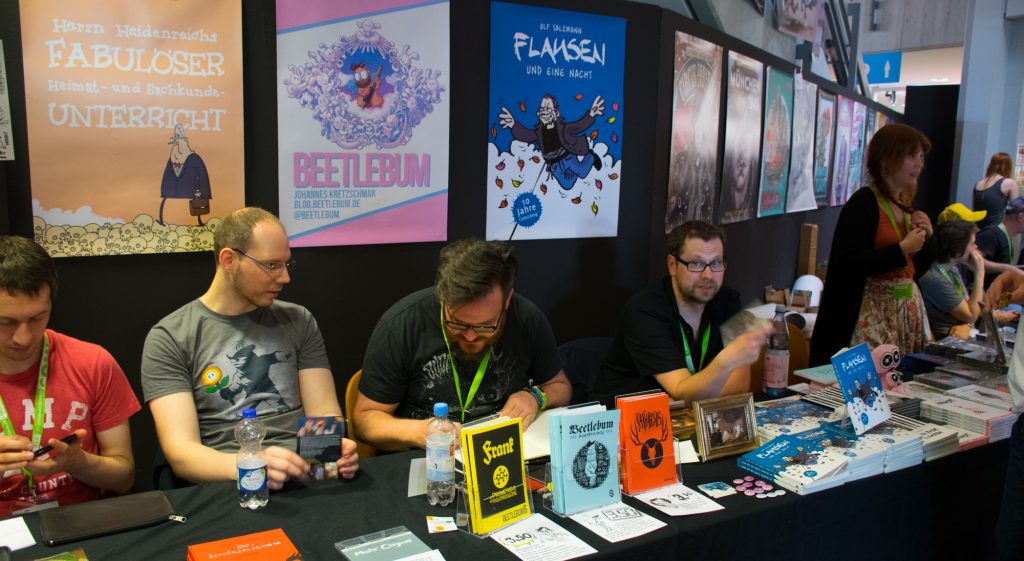 Da ich erst im Laufe des Nachmittags angekommen bin, blieb heute nur wenig Zeit für einen ersten Eindruck. Die neue Aufteilung wirkt durch die fehlende Abtrennung der Mangas deutlich bunter und abwechslungsreicher, gleichzeitig sind aber die Indie- und Kleinverlage nicht an einem Fleck, sondern verteilt auf zwei, wenn auch ausreichend große Bereiche. Auf der einen Seite hat man Aussteller wie den Schwarzen Turm, Jazam, Weissblech, Kwimbi und weitere, während am anderen Ende des Salons Verlage und Gruppen wie Edition Panel, Edition 52, Comicsolidarity, Finix, Hemispheres und andere verteilt sind. Der letztere Bereich verteilt sich über zwei Etagen, so dass man hier tatsächlich eine ganze Weile braucht bis man sich über alles einen Überblick verschafft hat. Aufgrund der Menge der Aussteller ist diese Aufsplittung zumindest verständlich. Im Kern dominieren wie gehabt die großen Aussteller wie Carlsen, Reprodukt, Splitter und Panini, wobei letztere dieses Jahr eine eigene kleinere Halle für sich bekommen haben. Auf diese Weise sollten die bei Panini oft üblichen langen Schlangen den restlichen Publikumsverkehr weniger behindern als in den sonstigen Jahren.