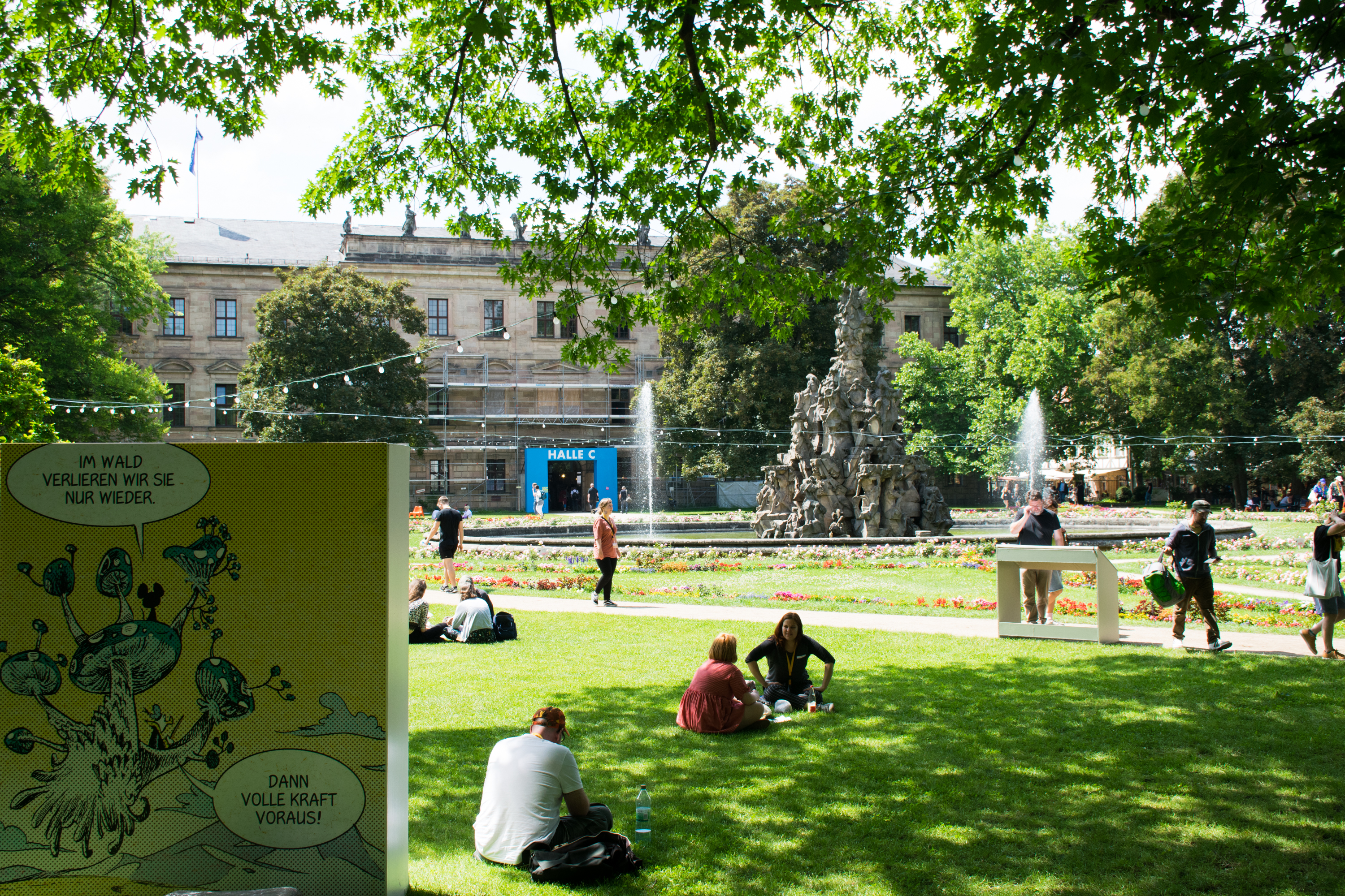 Der erste Tag galt traditionell erstmal vielen Begrüßungen und einer ersten vorsichtigen Sichtung was es alles an interessanten Ausstellern gibt. Neben der angenehmen räumlichen Nähe zwischen kleinen, mittleren und großen Verlagen war besonders die Halle C mit ihren Einzelkünstlern, den Hochschulen und Universitäten und dem von der Comic Solidarity bespielten hinteren Drittel interessant. Einzelkünstler und der Nachwuchs von den Schulen ist sonst immer etwas, das irgendwo oben zwischen den Ausstellungen steht und, zumindest von mir, viel zu oft dadurch sträflich vernachlässigt wurde. Hier zeigt sich das Zeltarrangement von seiner besten Seite und der am Donnerstag gewonnene Eindruck, dass die Lage im Schlosspark zusammen mit dem vollen Programmplan der Comic Solidarity für eine ordentliche Zugkraft sorgt, wird sich über die kommenden Tage tatsächlich bestätigen.